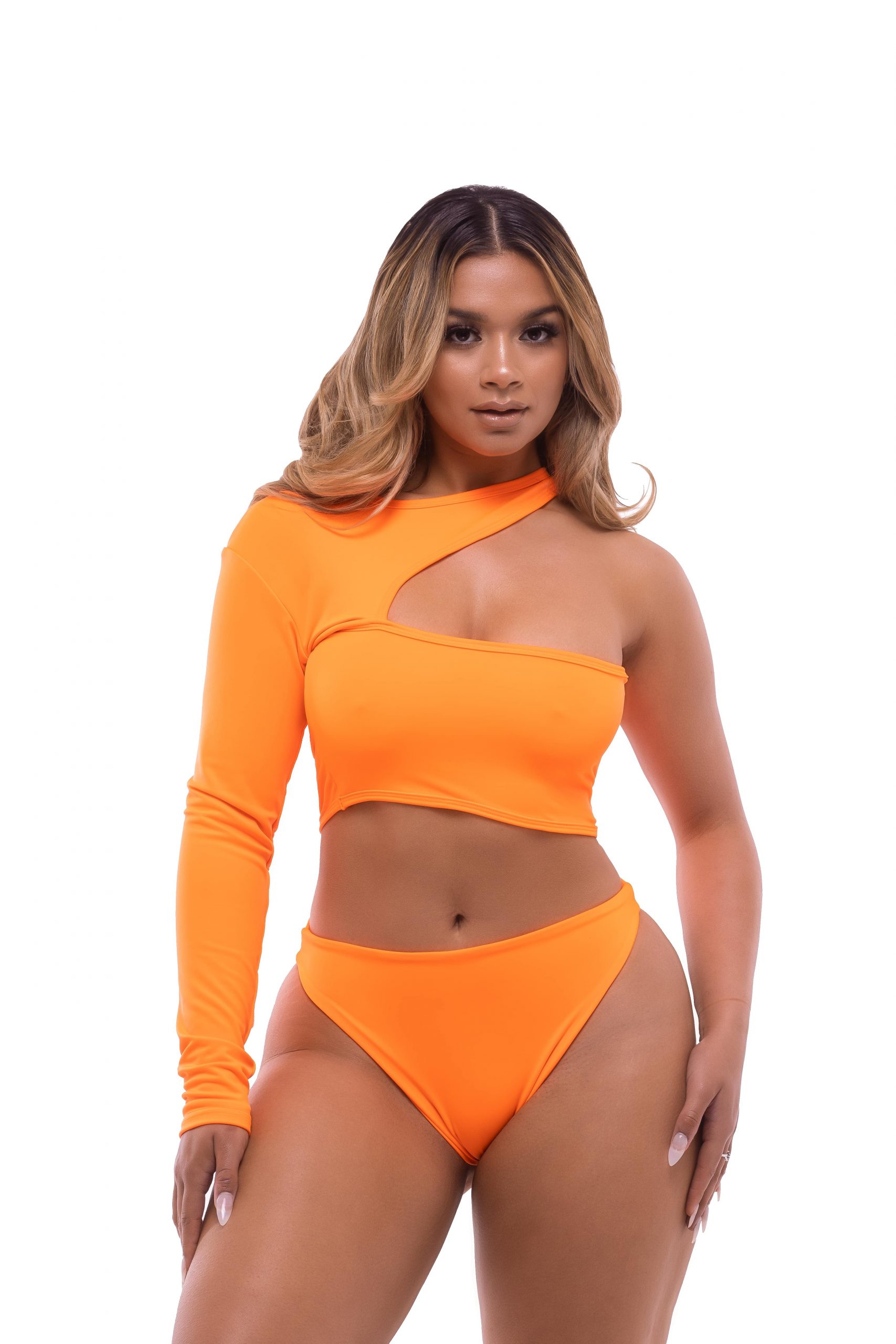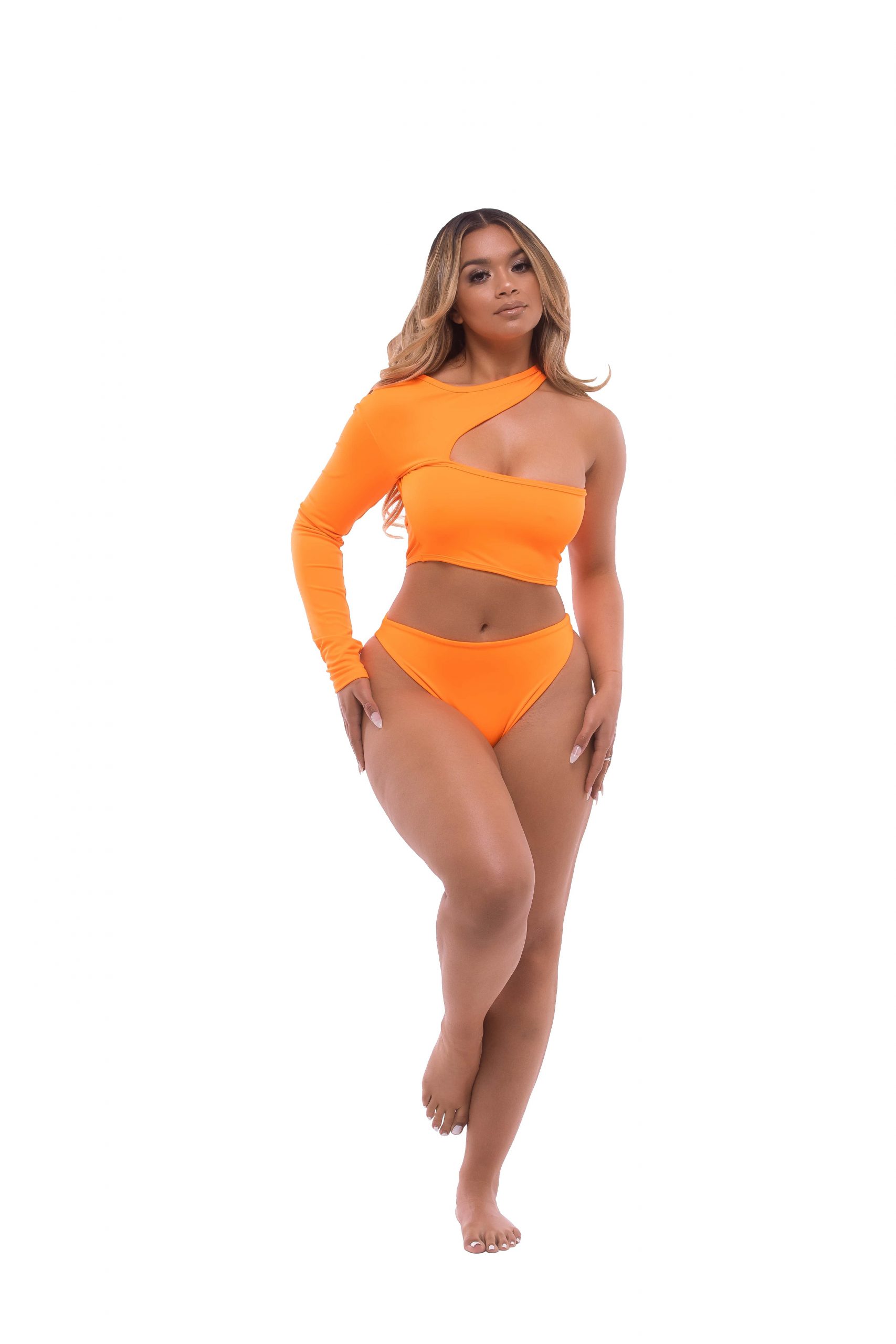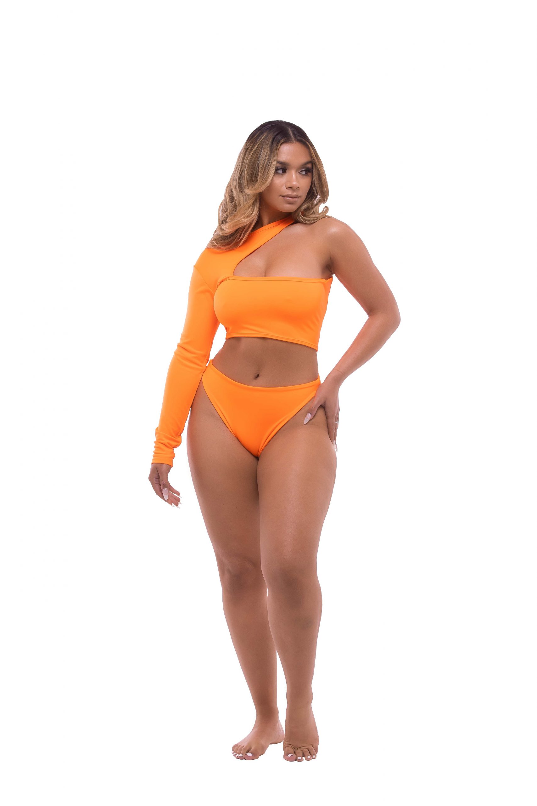 One sleeved, high cut, Brazilian bottom bikini.